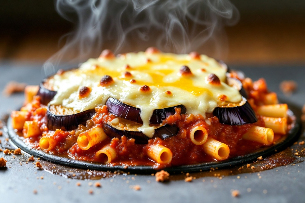 Hlavným hrdinom tohto receptu je baklažán. Nakrájaný na hrubšie kolieska dominuje chuti celého jedla, pričom paradajková omáčka ho dokonale dopĺňa. Tretiu dôležitú zložku tvoria cestoviny – v tomto prípade pláty na lasagne, ktoré umožňujú prehľadné vrstvenie zeleniny a omáčky. Na záver všetko posypeme parmezánom a pečieme do zlatista.
