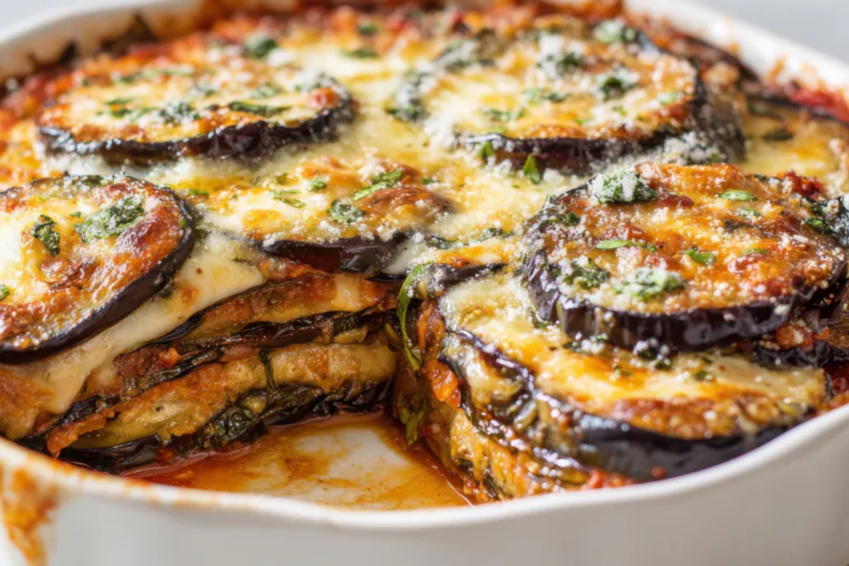 Hlavným hrdinom tohto receptu je baklažán. Nakrájaný na hrubšie kolieska dominuje chuti celého jedla, pričom paradajková omáčka ho dokonale dopĺňa. Tretiu dôležitú zložku tvoria cestoviny – v tomto prípade pláty na lasagne, ktoré umožňujú prehľadné vrstvenie zeleniny a omáčky. Na záver všetko posypeme parmezánom a pečieme do zlatista.